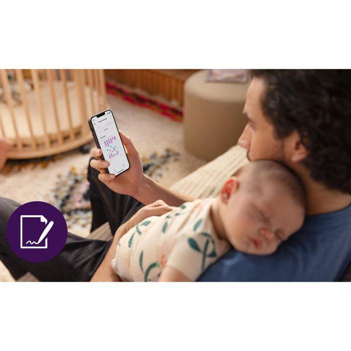 L'enregistrement automatisé du sommeil vous donne un aperçu complet des habitudes de sommeil de votre petit chéri. Le système enregistre jusqu'à 30 jours de statistiques sur le sommeil et vous aide à comprendre les changements dans les régressions du sommeil. Les données sont affichées sous forme de graphiques clairs, ce qui vous permet de reconnaître rapidement les tendances et de réagir en conséquence. Un environnement de sommeil confortable est bien sûr essentiel. Le thermomètre d'ambiance intégré vous avertit lorsque la température est trop élevée ou trop basse, afin que vous puissiez prendre des mesures immédiates. En outre, la veilleuse intégrée du babyphone vidéo Sense IQ SCD971/26 de Philips Avent diffuse une lumière douce et apaisante dans la pièce. Cette lumière est facile à régler via l'unité parents ou l'application, pour que votre bébé dorme toujours dans un environnement idéal.