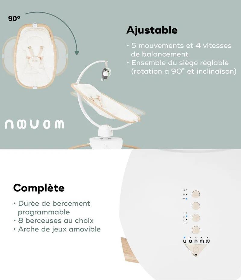 Vous pouvez ajuster la durée du bercement de 10 à 30 minutes selon vos besoins pour une sieste paisible ou un moment détente. Les 5 mouvements de balancements, aussi fluides que les bras des parents, associés aux 4 vitesses réglables, apaisent votre bébé en imitant les mouvements naturels.
