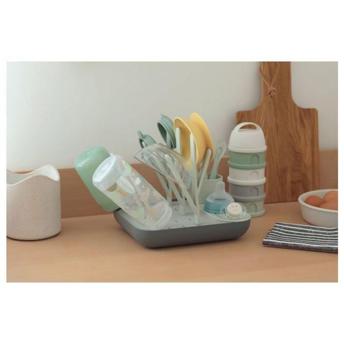Le fond amovible permet une évacuation optimale de l’eau, ce qui facilite l'élimination de l'excès d'eau et aide à prévenir la formation de moisissures. L'égoutte biberons Forêt de Béaba est éco-conçu et contribue à une réduction de 31 % des émissions de CO?, grâce à l'utilisation de 80 % de carton recyclé et de matériaux monocomposants. De plus, il est facile à ranger, car toutes les pièces s’emboîtent dans la base, rendant le séchoir compact et peu encombrant lorsque vous ne l’utilisez pas.