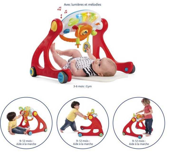 Ce portique et aide à la marche électronique évolue en fonction du développement moteur des tout-petits ! 4 modes de jeu : allongé, assis, premiers pas, debout. Centre d’activités électroniques avec de nombreux effets sonores. 2 jouets amovibles.