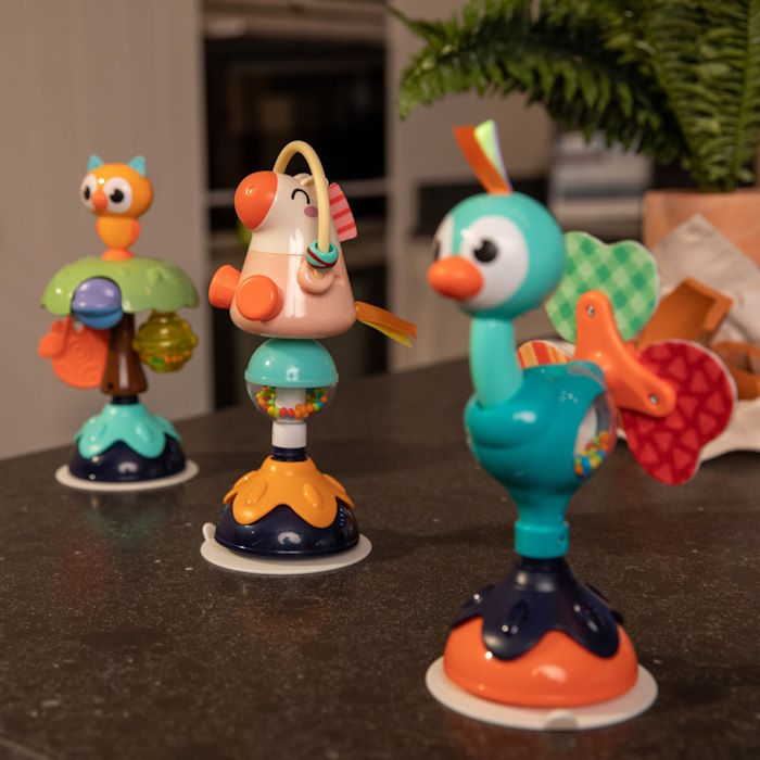 Ces jouets sont conçus pour les bébés âgés de six mois et plus. Chaque jouet comporte une base à ventouse et est conçu pour être fixé au plateau-repas afin d’empêcher votre tout-petit de le jeter par terre pendant les crises de colère. Les fonctions amusantes et intéressantes permettent de divertir votre bébé et l’encouragent à rester assis au moment des repas.