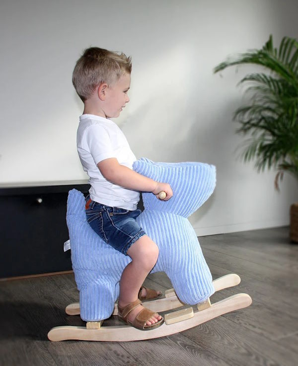 Le chien est fait de velours côtelé et se sent bien et doux. Les repose-pieds en bois permettent également à votre tout-petit de s'asseoir confortablement et de se déplacer sans être dérangé. Le design moderne est également un ajout à la pépinière ou au salon.