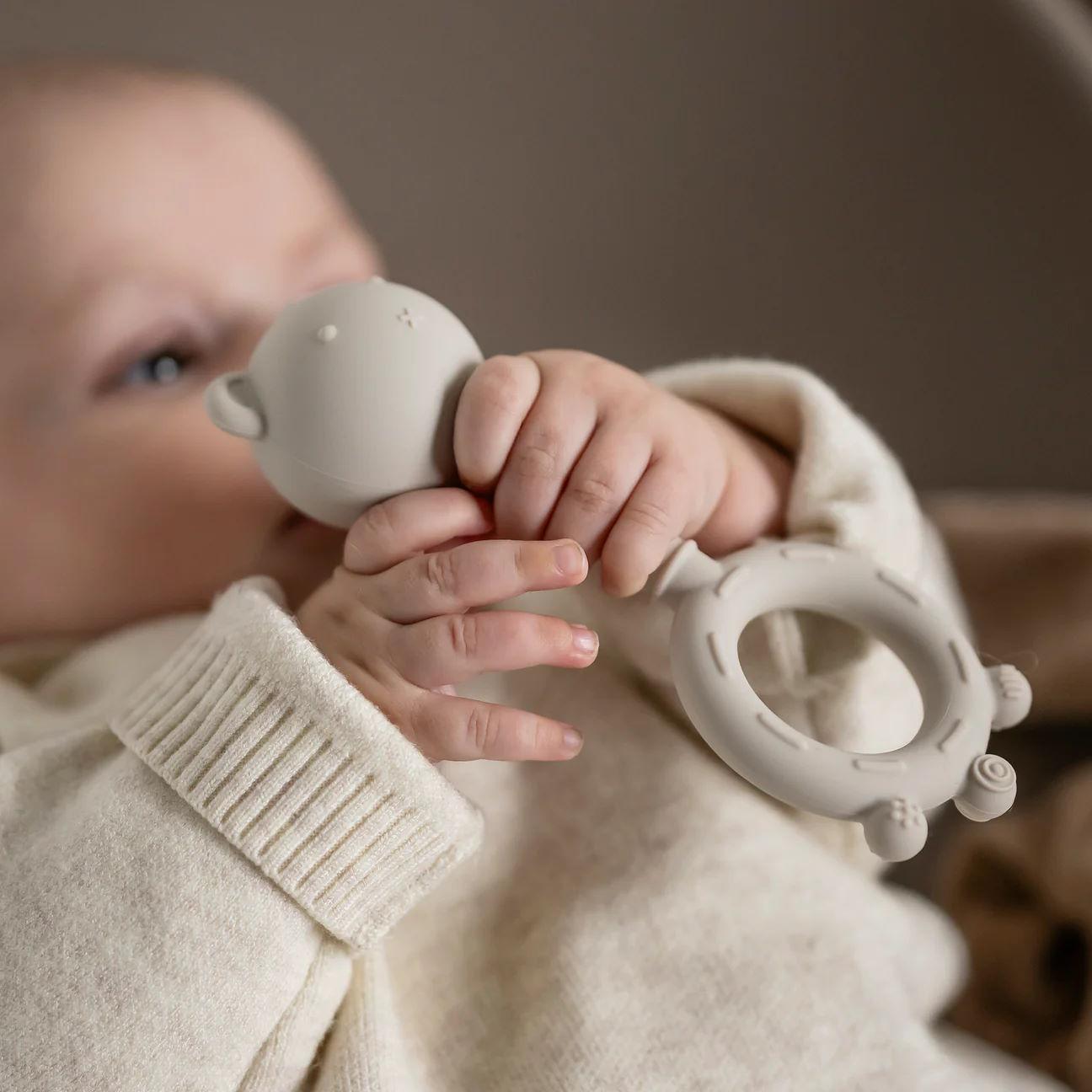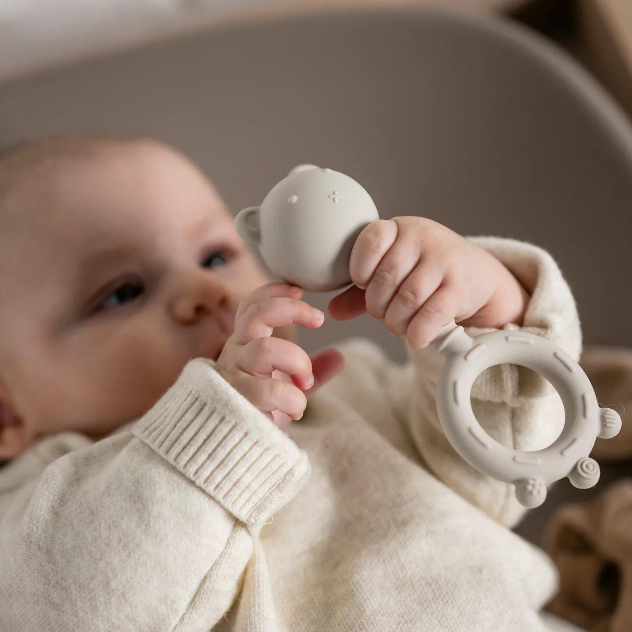 Un hochet avec une double fonction! En tant qu'anneau de dentition souple, l'ours procurent un massage bénéfique aux gencives, soulageant de manière sensible l'inconfort des premières dents. En tant que hochet, l'ours convient parfaitement aux mains fragiles de votre petit.