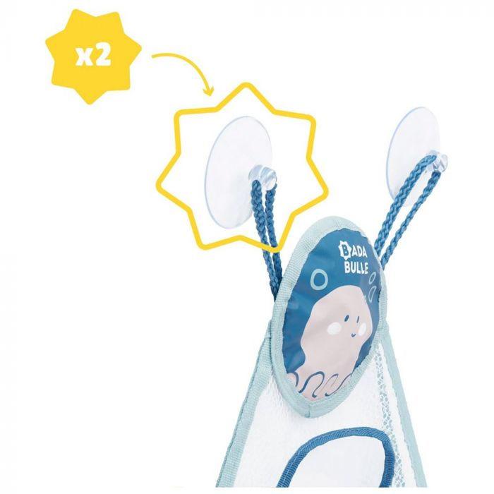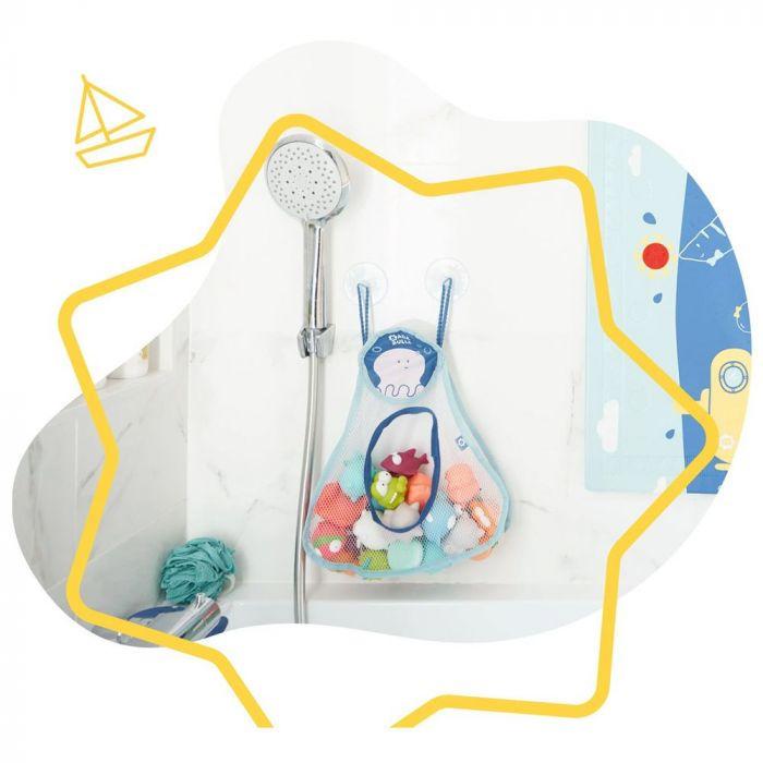 Le filet de bain de Badabulle permet un rangement hygiénique des jouets de bébé après le bain.