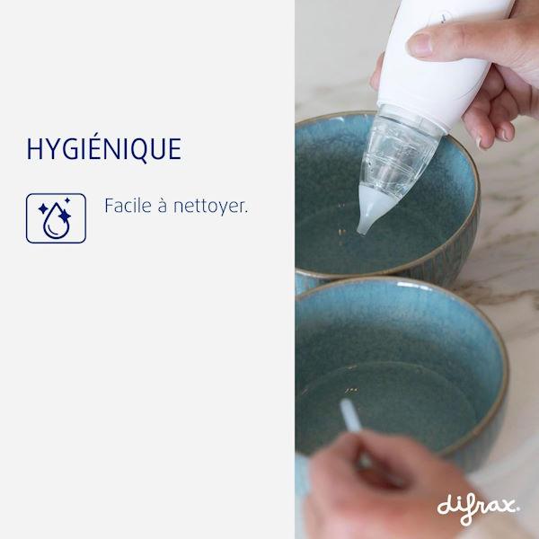 Le mouche-bébé électrique de Difrax nettoie le nez de votre bébé en quelques secondes et permet à votre enfant de respirer librement. L'ensemble inclut deux embouts en silicone doux et interchangeables : l'un étroit, pour les petits enfants ou le mucus liquide, l'autre large, pour les enfants un peu plus grands ou le mucus collant et épais.
