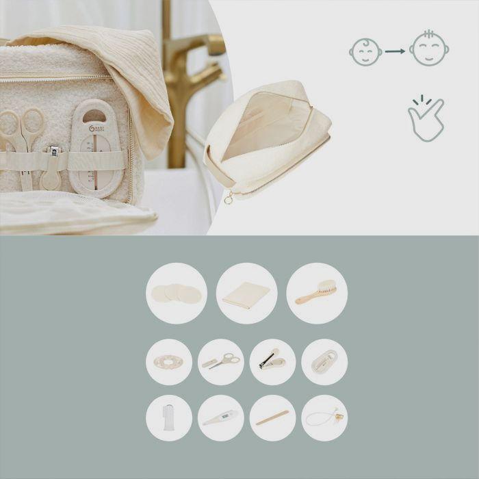 Avec la trousse de soin x Babyatoutprix de Babymoov, vous bénéficiez d'un contenu complet de pas moins de 11 accessoires indispensables. Vous disposez ainsi d'une lingette douce double tissage, de 3 lingettes réutilisables en microfibre, d'une brosse, de 2 thermomètres, d'une lime à ongles, d'un cure-nez, d'un anneau de dentition et même d'un masseur de gencives. Tout ce dont vous avez besoin pour prendre soin de votre bébé avec soin et attention est inclus en standard ! Le design combine une finition en tissu éponge ultra-doux avec des fermetures à glissière et une poignée confortable en similicuir. L'intérieur déperlant évite les fuites et se nettoie facilement. La trousse de soins de Babymoov n'est pas seulement pratique pour votre bébé, elle convient aussi aux tout-petits, aux enfants et même aux adultes. C'est donc un accessoire que vous pourrez utiliser pendant des années.