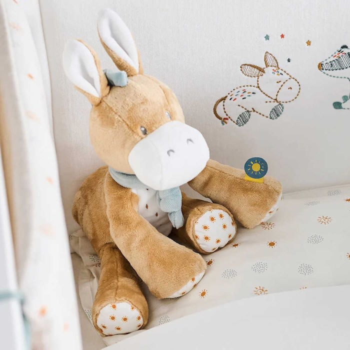 Une peluche musicale, c'est Leo l'âne tout entier ! Cette peluche musicale avec une boîte à musique intégrée régale votre tout-petit avec une douce mélodie "La-Le-Lu". De plus, le dispositif musical de cette peluche est également conçu comme un anneau de dentition, stimulant ainsi non seulement les réflexes de préhension de votre bébé, mais aussi soulageant la douleur lors de la poussée des dents. Le tissu moelleux rend la peluche Leo l'âne incroyablement câline et agréable à saisir.