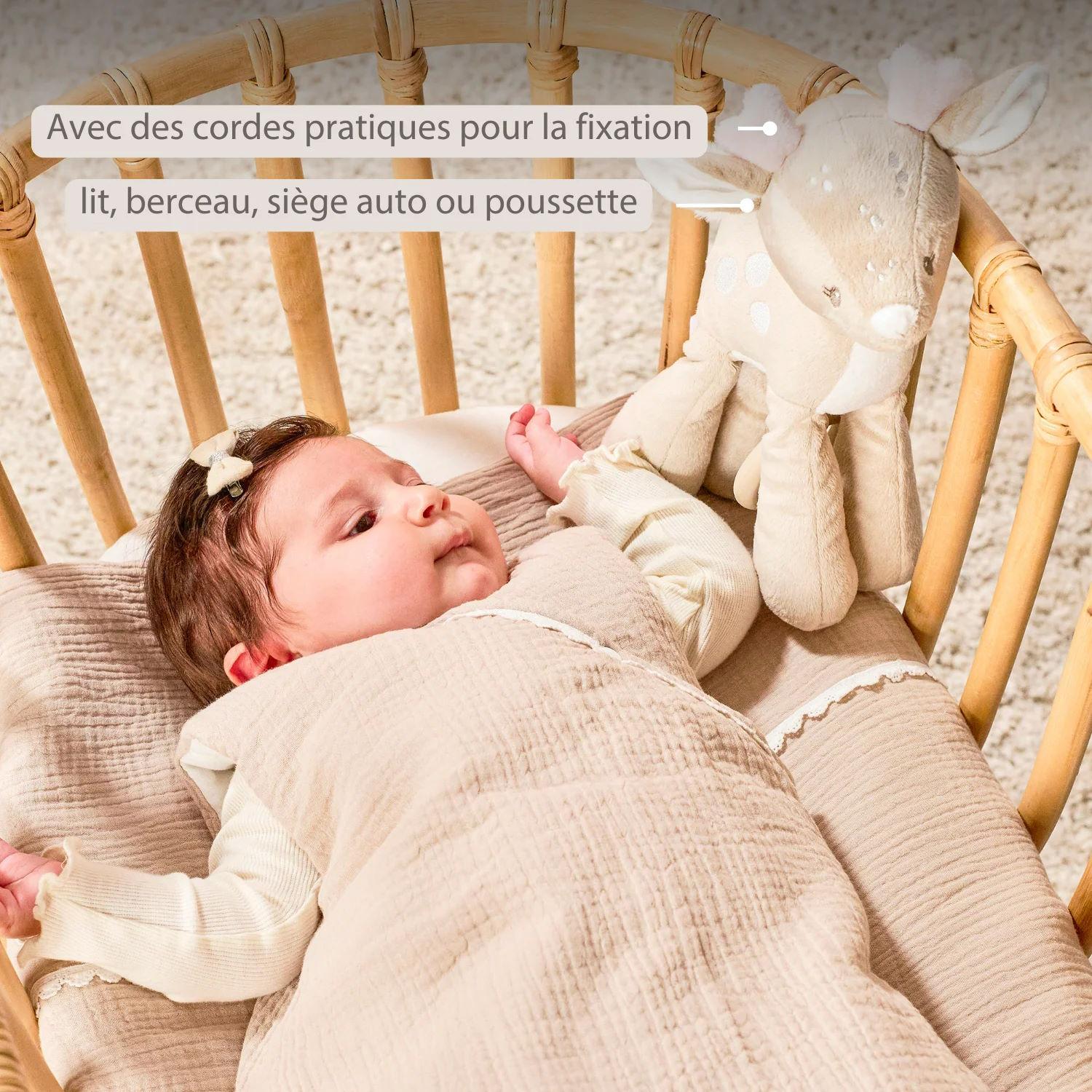 Équipé de cordons pour l'attacher au lit de bébé, au lit d'enfant, à la poussette ou au siège-auto