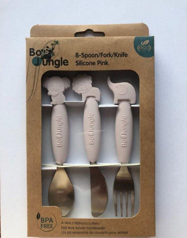 Un ensemble de couverts pour enfant composé d'une cuillère, d'une fourchette et d'un couteau. Les couverts sont fabriqués avec des matériaux de haute qualité (acier inoxydable et silicone) et sont faciles à tenir par de petites mains, grâce aux manches en silicone. Passe au lave-vaisselle.