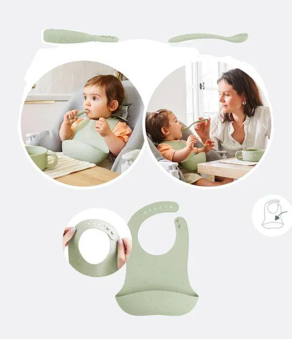 Complet : bavoir à récupérateur réglable, bol à anses, cuillère “parent” en silicone, cuillère “bébé” à cuilleron plat développée avec une ergothérapeute