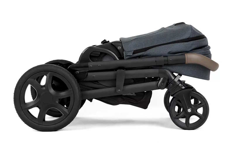 - Pour faciliter l'emballage, un mécanisme de verrouillage automatique maintient le châssis fermé, de sorte que vous pouvez rouler la poussette pliée à côté de vous en mode chariot