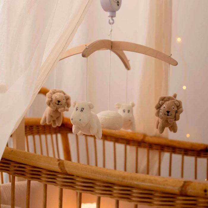 Eveillez votre bébé dans un monde magique avec ce mobile musical de la collection « Tamtam ». Décoré de doux hippopotames et lions aux teintes apaisantes blanche et écru et d’un bras en bois naturel, ce mobile s’intègre harmonieusement dans toute chambre d’enfant.