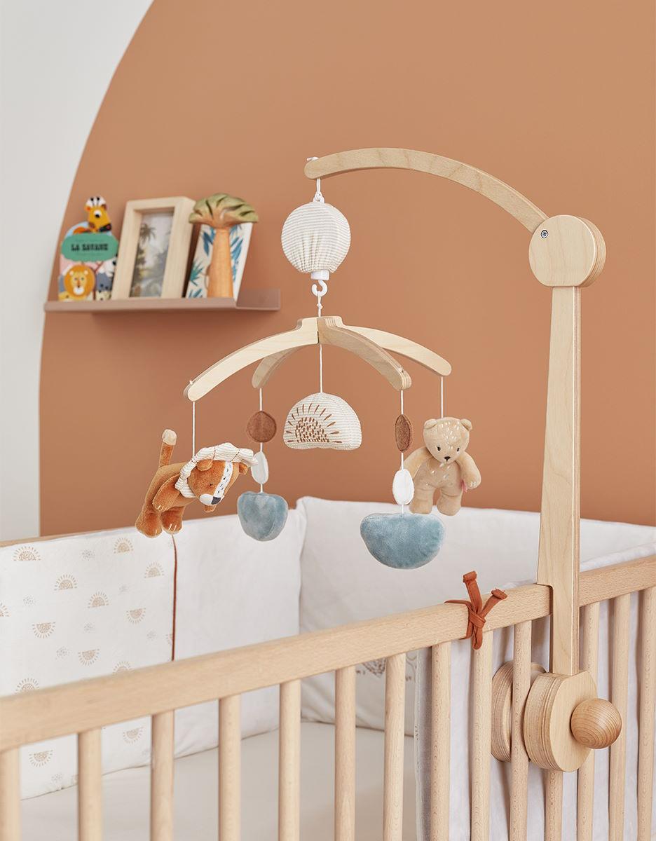 Le mobile musical en bois à l'effigie de la collection Babou & Kendi aide bébé à s'endormir en douceur sous l'œil bienveillant de Babou et Kendi.