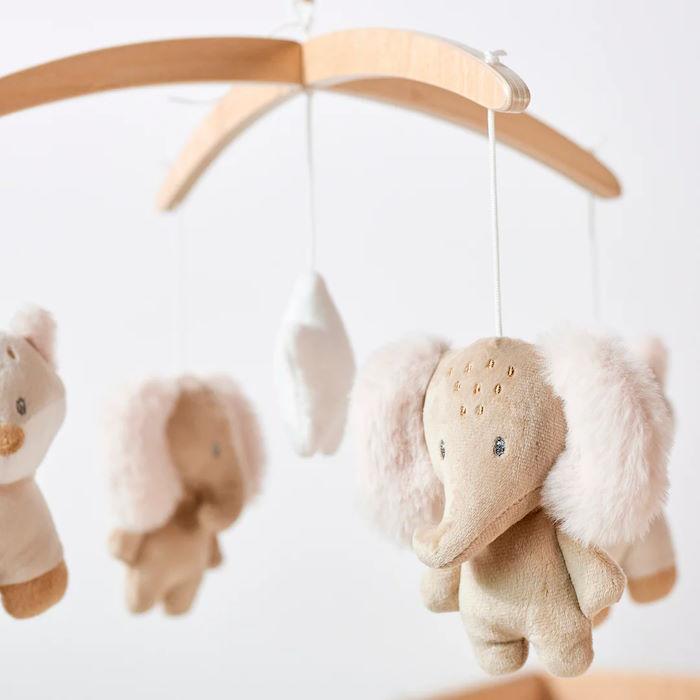 Laissez votre petit profiter des mélodies apaisantes du mobile musical pendant que les petits éléphants et les renards tournent doucement. Avec ces adorables petits figurines, le mobile n'est pas seulement un élément attrayant dans la chambre d'enfant, il favorise également la perception auditive de votre bébé grâce à la boîte à musique intégrée qui joue une douce mélodie "Le-La-Lu". Vous pouvez fixer ce mobile musical en toute sécurité et facilité sur le lit, le parc ou le landau de votre bébé. Toutes les figurines sont amovibles et peuvent être lavées en machine.