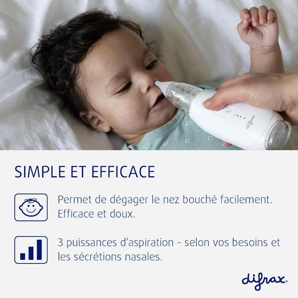 Le mouche-bébé électrique de Difrax nettoie le nez de votre bébé en quelques secondes et permet à votre enfant de respirer librement. L'ensemble inclut deux embouts en silicone doux et interchangeables : l'un étroit, pour les petits enfants ou le mucus liquide, l'autre large, pour les enfants un peu plus grands ou le mucus collant et épais.