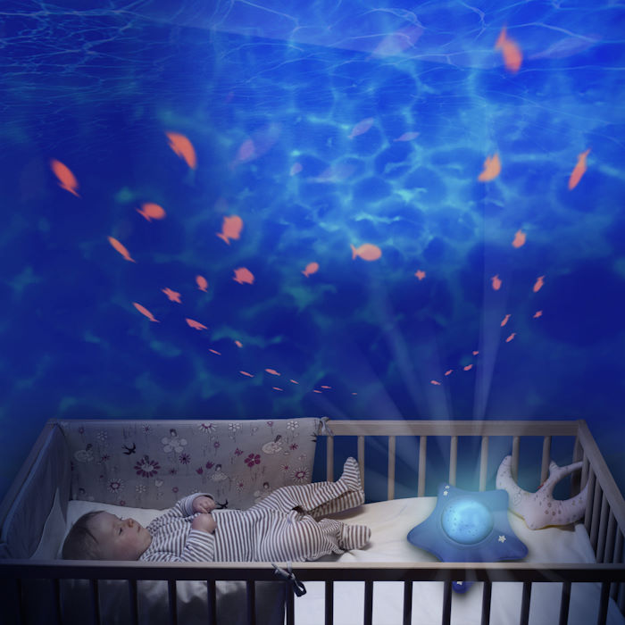 Les projections de Calm Ocean associent effets de vagues et poissons qui nagent, comme si on était sous l’eau. En plus, le projecteur diffuse également une douce ambiance musicale, créant ainsi une atmosphère incroyablement relaxante. Pour faciliter le sommeil, les projections et la musique évoluent en fonction de la phase d’endormissement et accompagnent l’enfant dans les bras de Morphée.